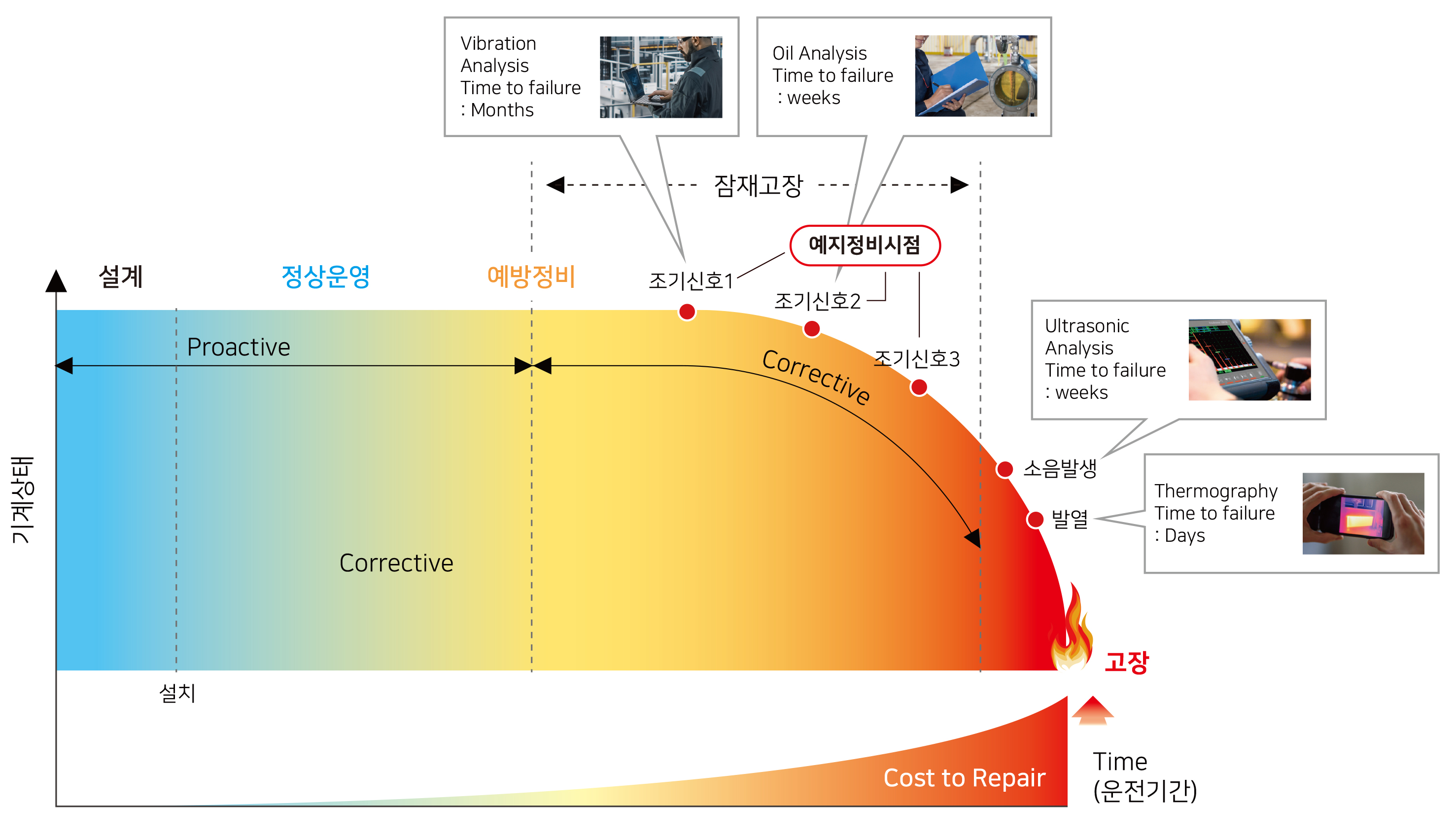 즉,현재 시점의 설비 건강도 값과 그 값이 변화해온 이력을 Projection하여 이러한 추세와 패턴이 실제로 설비 고장에 대한 Threshold에 언제 도달할지 예측해낼 수 있는 것입니다.