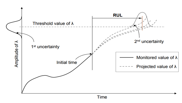 즉,현재 시점의 설비 건강도 값과 그 값이 변화해온 이력을 Projection하여 이러한 추세와 패턴이 실제로 설비 고장에 대한 Threshold에 언제 도달할지 예측해낼 수 있는 것입니다.